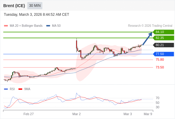 在 77.50 之上,看涨,目标价位为 82.35 ,然后为 84.10 。
