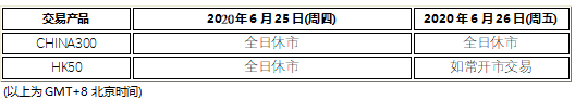 因应2020年6月25日(周四)为中国大陆和香港端午节假期,沪深300指数CHINA300和恒生指数HK50将于假期期间休市,敬请阁下留意知悉: