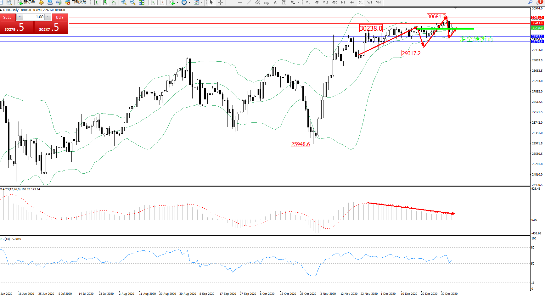 道琼斯指数DJ30—— 日K线图显示:
