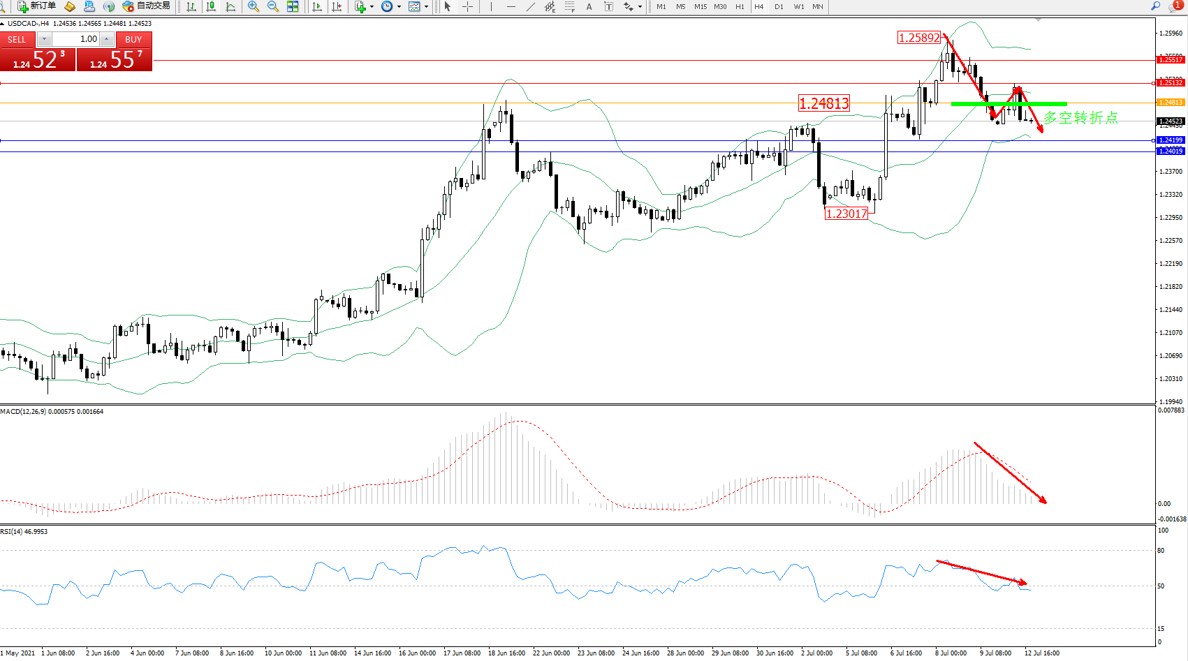 交易策略:1.24813下方看跌,目标1.24199、1.24019