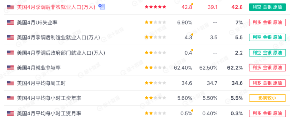 上周五20:30公布的美国非农就业报告显示,美国4月季调后非农就业人口增加42.8万人,高于预期的增加39.1万人,4月失业率与上个月的3.60%持平,高于预期的3.5%。