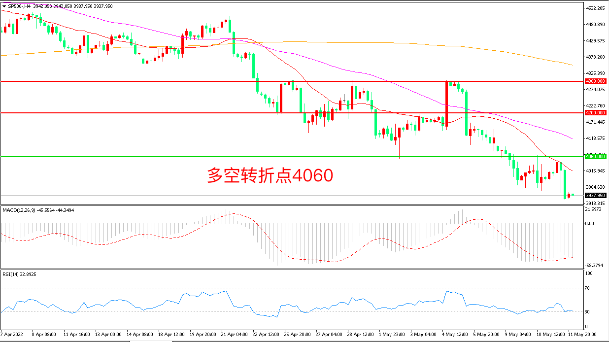 周三(5月11日),美国4月CPI同比增长8.3% ,处于40年高位附近,投资者预期美联储为了对抗通胀不得不加快加息节奏,标普500先涨后跌,收报3942.05点。目前美股龙头科技股全线回落,投资者看跌的负面情绪越来越浓重,“踩踏式”平仓将给标普带来巨大压力,短期维持下行概率较大。