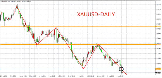 周四美盘时段,黄金突然急剧下挫逾30美元,由1691水平迅速走低至1660,创2020年4月13日当周以来新低。周二(9月13日)美国8月CPI数据出炉后,美联储更激进加息的预期不断升温,令黄金遭遇了持续的抛售。