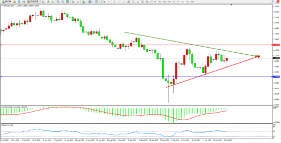 波幅空间逐渐收窄,呈收窄三角形态走势中,上方压制关注1.15446附近,低位支撑关注1.08786附近,首次整体波幅收窄后面临新一轮突破,MACD指标处于空头区域维持震荡上移至0轴线下侧弱势徘徊,RSI指标处于50均衡线附近弱势整理,如图: