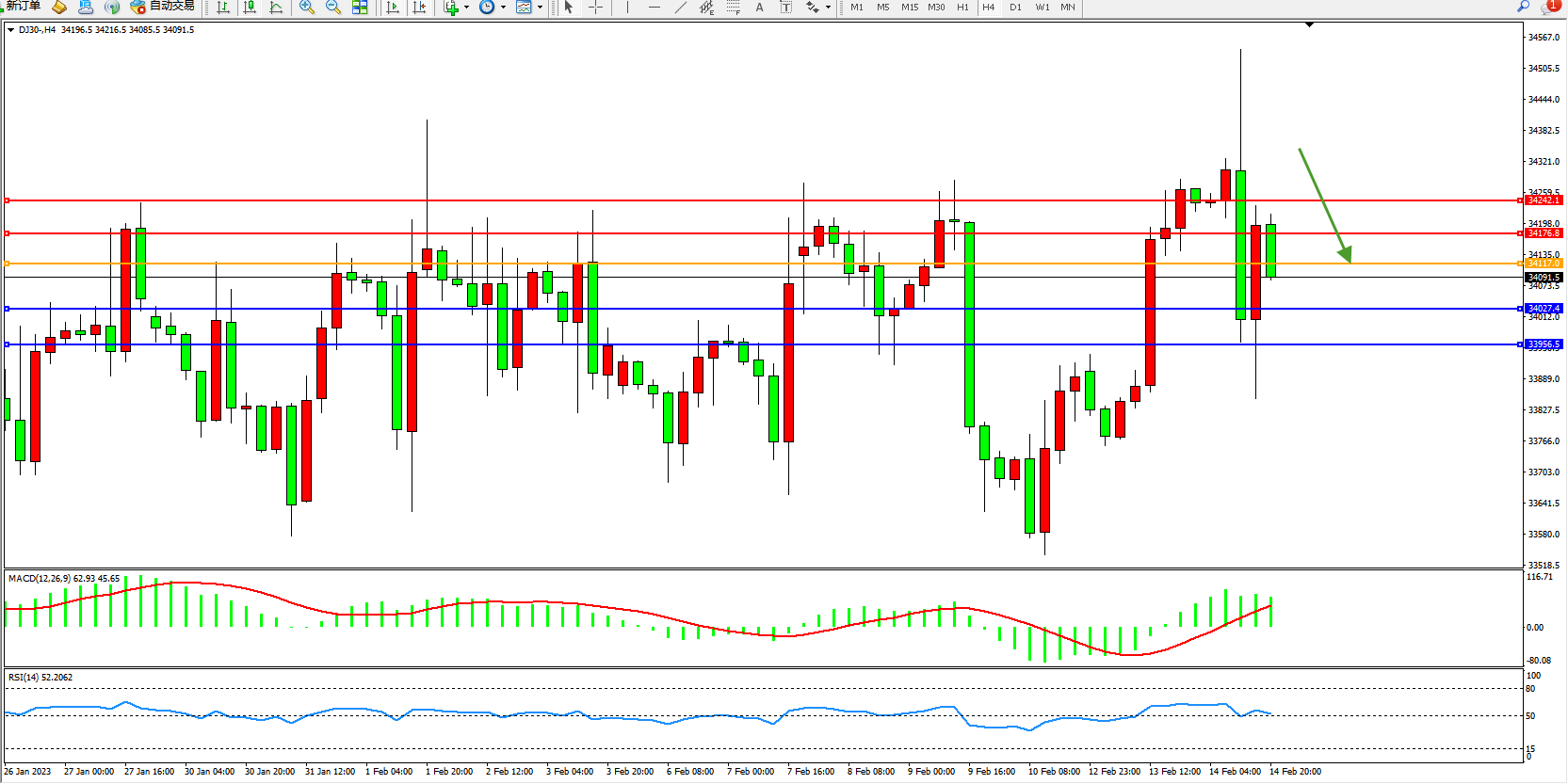 道琼斯指数DJ30——4小时K线图显示: