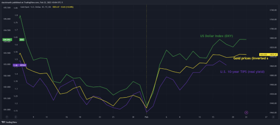 受实际收益率和美元强劲反弹的拖累,黄金价格在2月份下跌了超过5%。自今年年初以来,这三种资产之间出现了强烈的相关性关系,其中黄金与美元和美债收益率是负相关性关系。