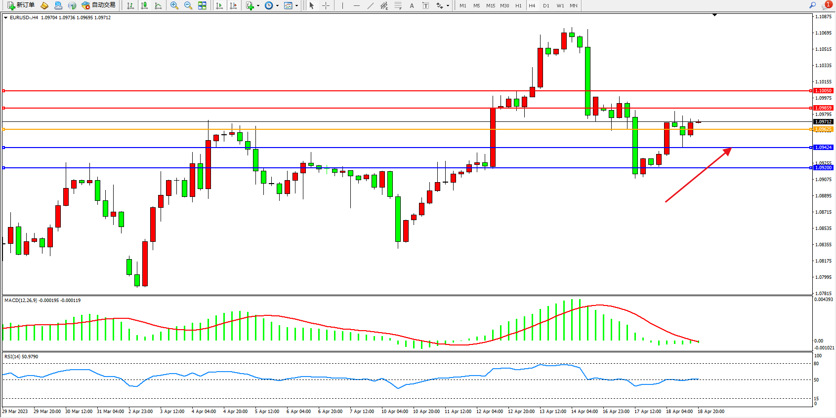4小时图看:多头动力维持震荡上行,市场看涨情绪依旧,短期有继续向上移动迹象,MACD指标处于0轴线下侧徘徊,RSI指标处于50均衡线附近弱势整理;