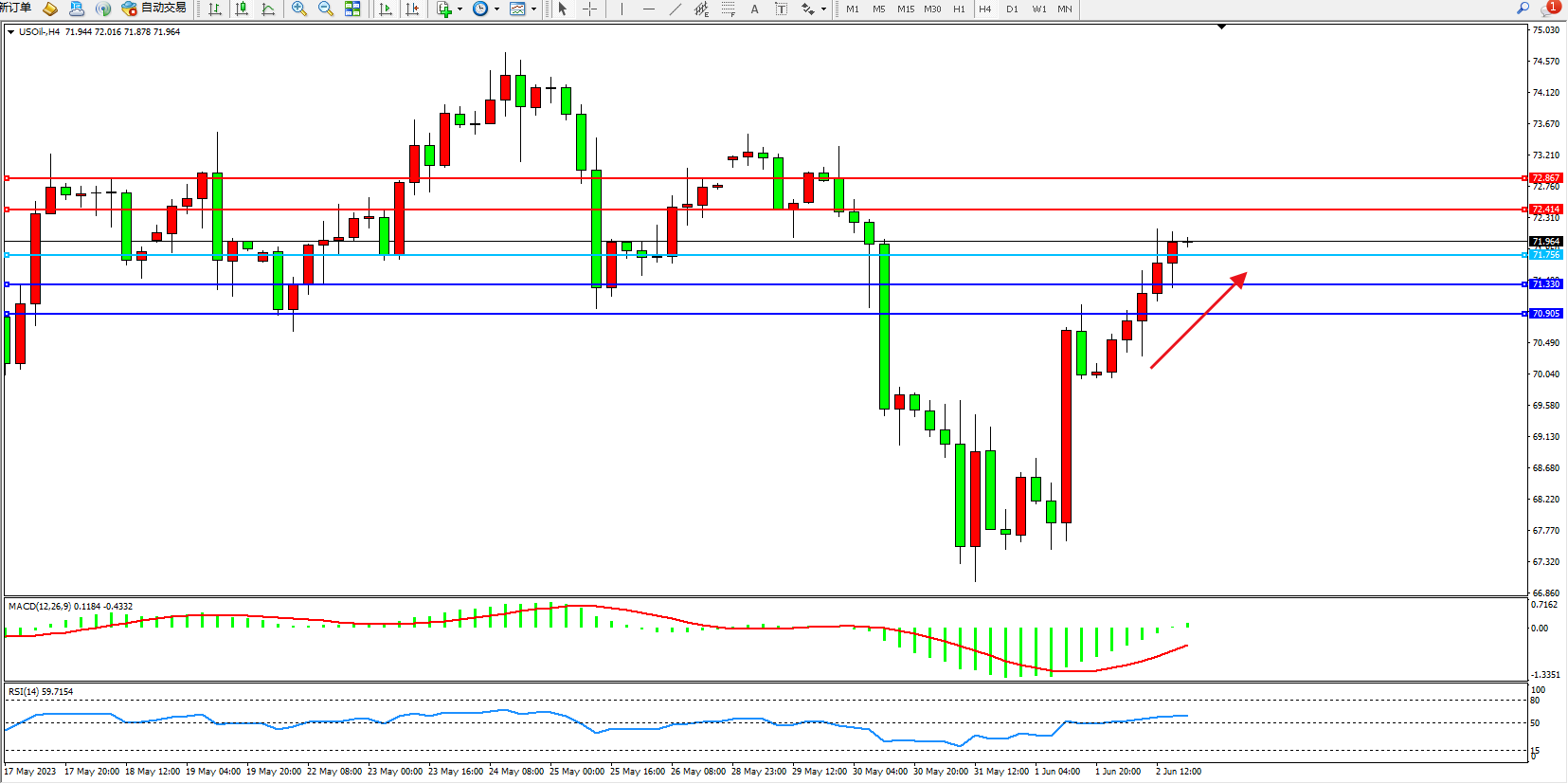 交易策略:71.756上方看涨,目标74.414  72.867